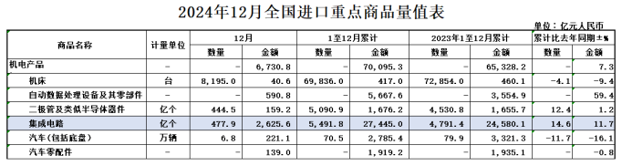 2024年我国机电产品进出口、出口和顺差均创新高。全年机电产品进出口总值为22.13万亿元,出口15.12万亿元,进口7.01万亿元,同比分别增长8.3%、8.7%和7.3%。其中,机电产品出口增速高于全商品1.6个百分点,在拉动货物出口稳定增长方面,发挥主力军作用;在全商品出口中的占比为59.4%,较2023年的58.5%提升0.9个百分点,凸显机电出口韧性和货物出口的产业升级。其中集成电路进口总值2.74万亿元,同比增长11.7%;集成电路出口总值1.14万亿元,同比增长18.7%。(海关总署)