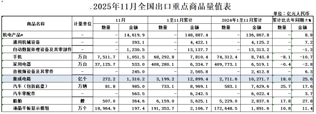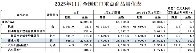 2025年1-11月,我国出口集成电路1.29万亿元,增长25.6%;进口集成电路2.73万亿元,增长10.2%