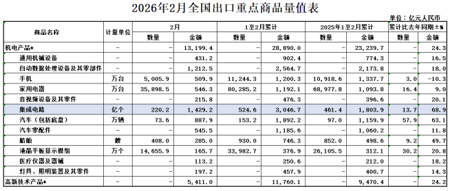 前2个月,我国出口机电产品2.89万亿元,增长24.3%;其中,自动数据处理设备及其零部件2564.7亿元,增长18%;集成电路3046.7亿元,增长68.9%;汽车1892.2亿元,增长63.1%。