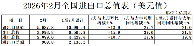 按美元计价,2026年前2个月,我国进出口总值1.10万亿美元,增长21.0%。其中,出口6565.8亿美元,增长21.8%;进口4429.6亿美元,增长19.8%。2月份我国进出口总值5087.8亿美元,增长27.7%。其中,出口2998.8亿美元,增长39.6%;进口2089.0亿美元,增长13.8%。(海关总署)