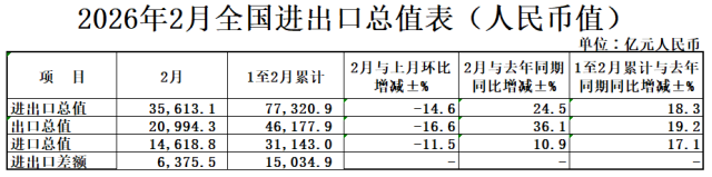 据海关统计,2026年前2个月,我国货物贸易进出口总值7.73万亿元人民币,同比(下同)增长18.3%。其中,出口4.62万亿元,增长19.2%;进口3.11万亿元,增长17.1%。2月份,我国货物贸易进出口总值3.56万亿元,增长24.5%。其中,出口2.10万亿元,增长36.1%;进口1.46万亿元,增长10.9%。